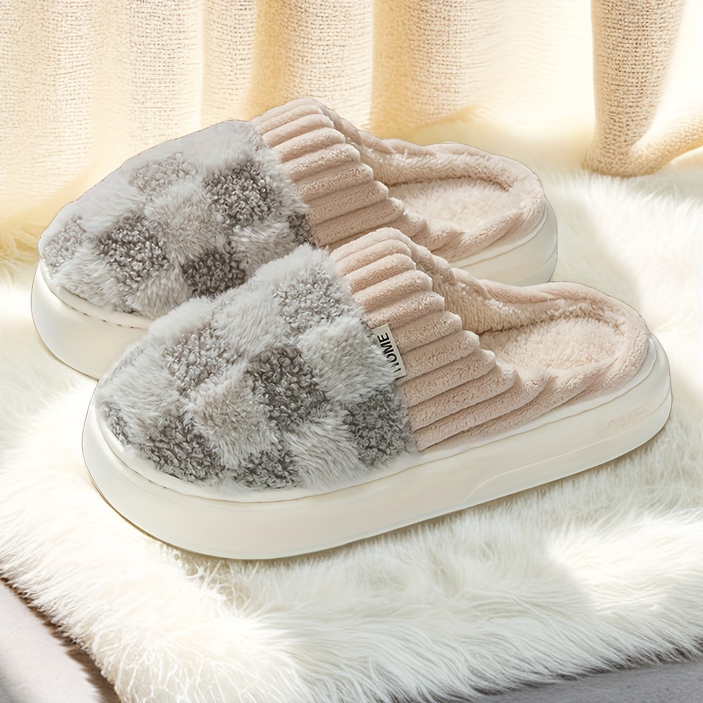Checkered Fluffy Warm Home Slippers, Winter Closed Toe Soft Sole House Shoes, Cozy Bedroom Plush Slippers
