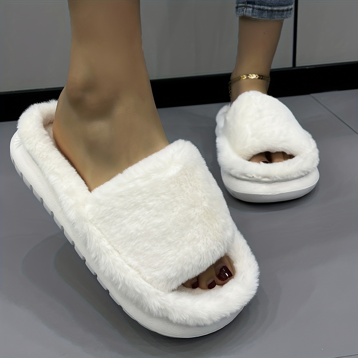 Women's Fuzzy Plush Platform Slippers, Comfy Open Toe Non-slip Bedroom Shoes, Indoor Outdoor Shoes