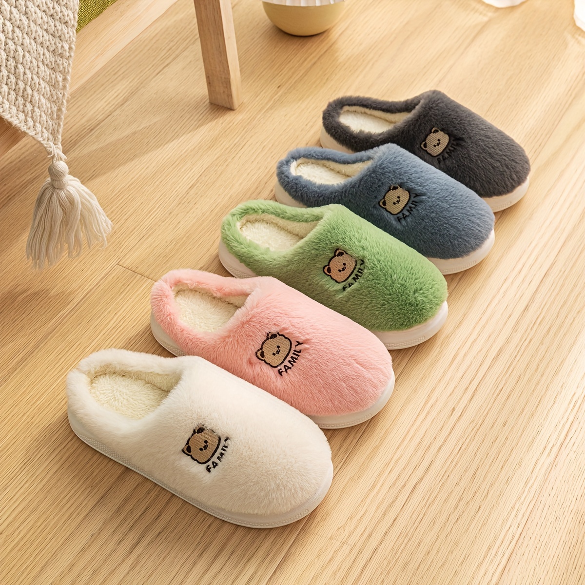 Cute Bear Winter Plush Slippers, Closed Toe Slip On Flat House Shoes, Cozy & Warm Home Floor Slippers
